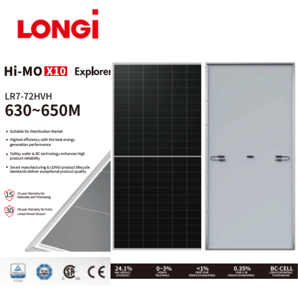 Tấm pin LONGi LR7-72HVH-645M thuộc dòng Hi-MO X10 – thế hệ mô-đun cao cấp mới nhất của LONGi Solar, nổi bật với công nghệ TaiRay wafer kết hợp Back Contact (BC), giúp mô-đun đạt hiệu suất lên đến 24.1%, đứng đầu phân khúc tấm pin hiệu suất cao hiện nay.
